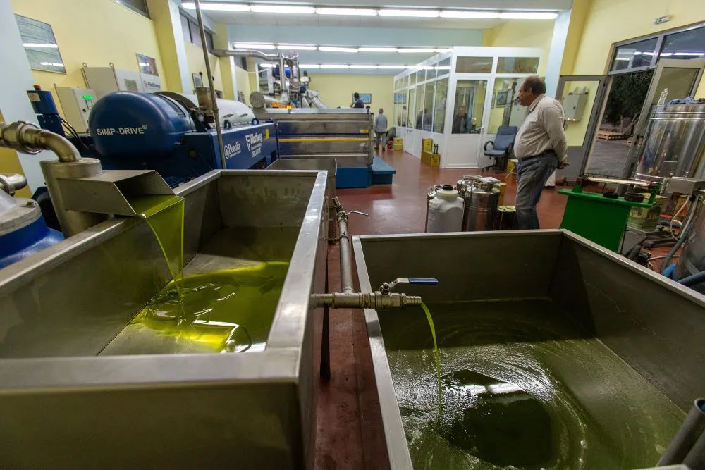 ↑希臘伯羅奔尼撒半島麥西尼亞一家橄欖油廠的橄欖油生產(chǎn)線。