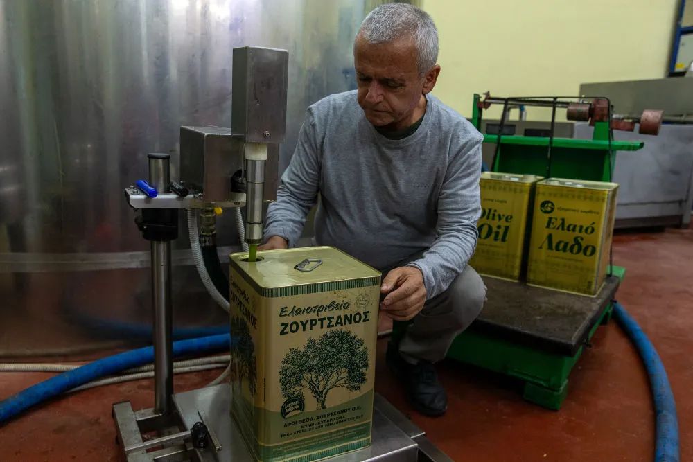 ↑工作人員在希臘伯羅奔尼撒半島麥西尼亞的一家橄欖油廠灌裝橄欖油。
