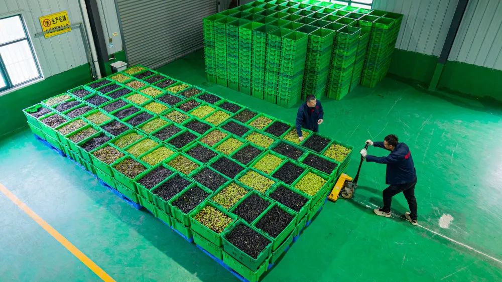 ↑在甘肅省隴南市武都區(qū)一家油橄欖加工企業(yè),工人轉(zhuǎn)運(yùn)成筐的油橄欖鮮果。