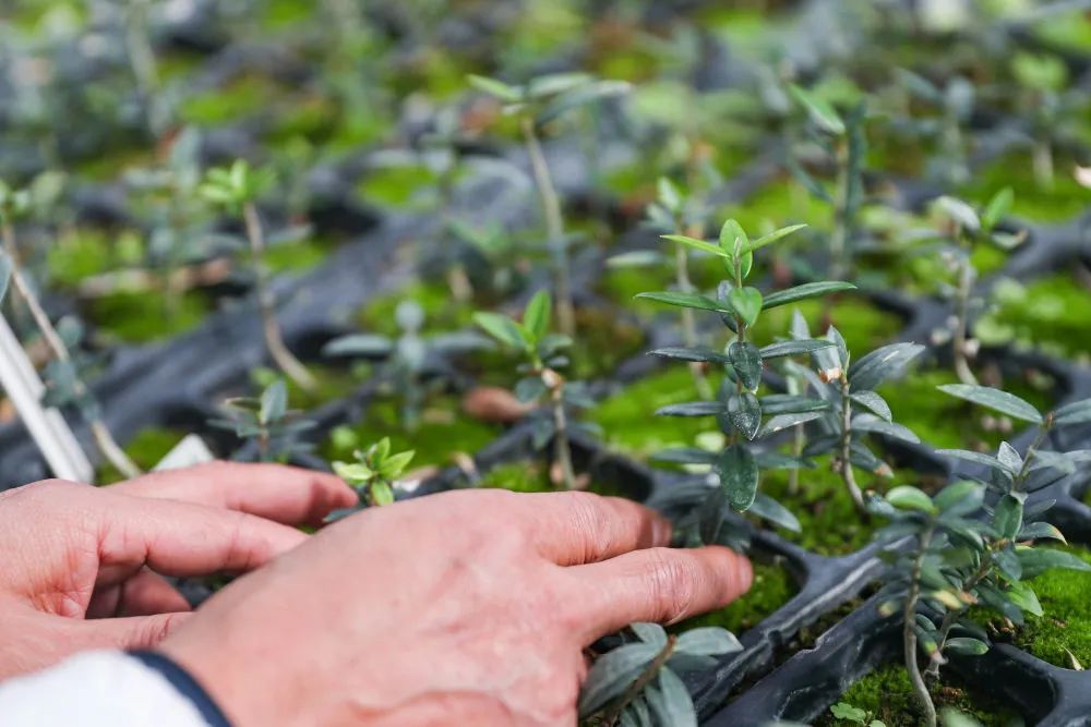 隴南市經(jīng)濟(jì)林研究院油橄欖研究所高級(jí)工程師王貴德觀察航天育種的油橄欖苗生長(zhǎng)情況。