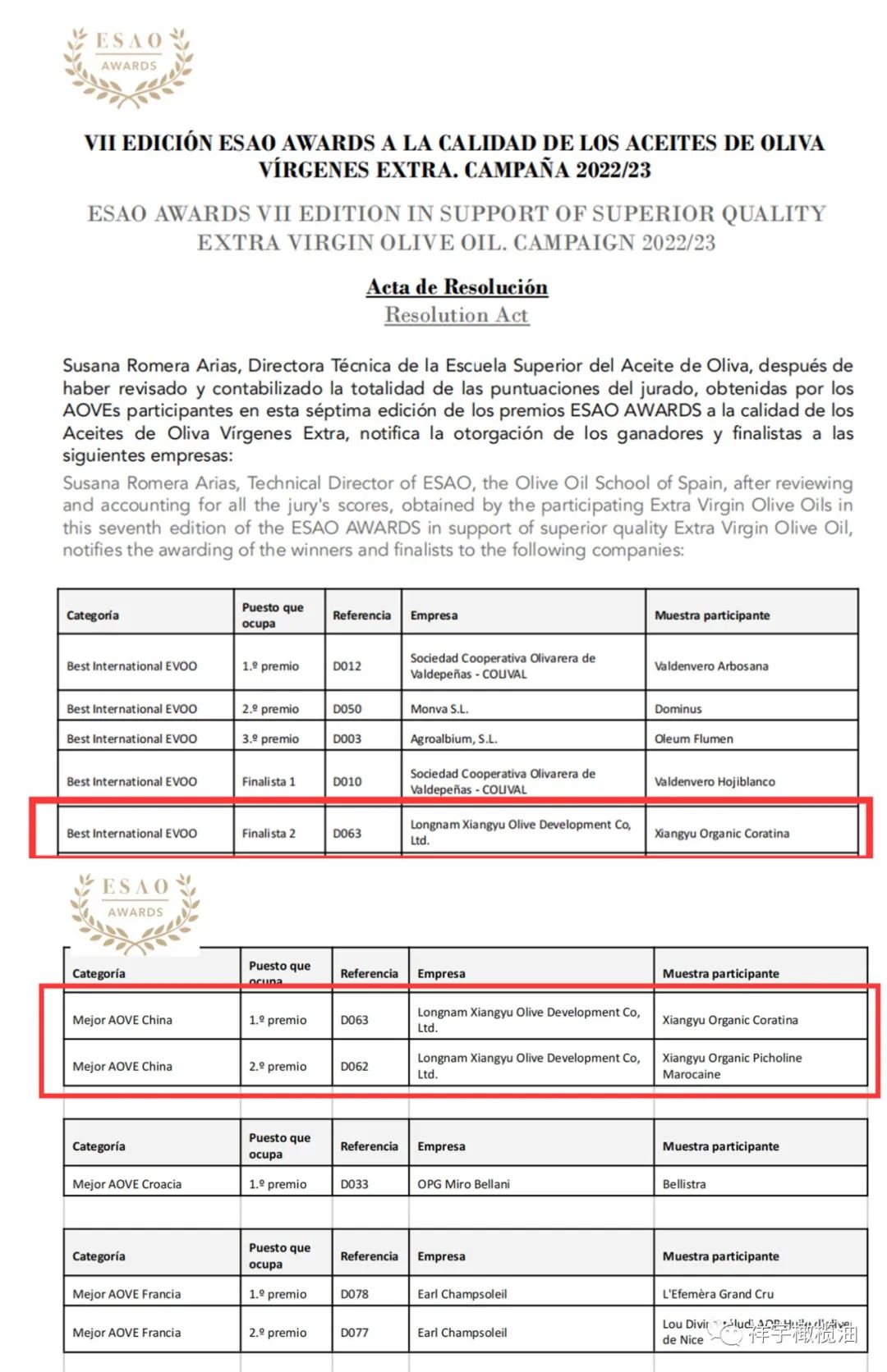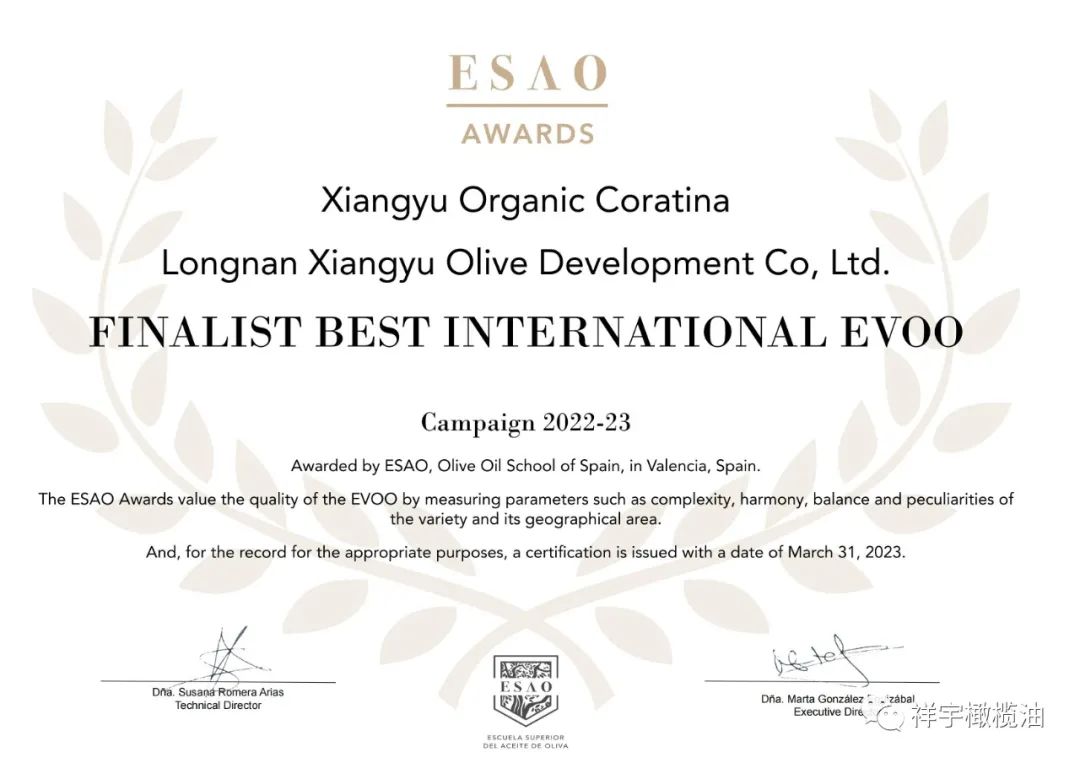 “ESAO Awards”中榮獲中國最佳特級初榨橄欖油一等獎,